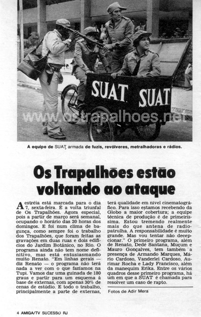 A estréia está marcada para o dia 7, sexta-feira. E a volta triunfal de Os Trapalhões. Agora especial, pois a partir de março será semanal, ocupando o horário das 20 horas dos domingos. E foi num clima de bagunça, como sempre foi o trabalho dos Trapalhões, que foram feitas as gravações em duas ruas e dois edificíos do Jardim Botânico, no RIO. O programa ainda náo tem nome definitivo, mas está entusiasmando muito Renato. "Em linhas gerais - diz Renato - o programa não terá nada a ver com o que fazíamos na Tupi. Vamos dar uma guinada de 180 graus e partir para um esquema à base de externas, com apenas 30% de cenas de estúdio. E todo o trabalho, principalmente a parte de externas, terá qualidade em nivel cinematográfico. Para isso estamos recebendo da Globo a maior cobertura; a eqmpe técnica de produção é de primeiríssima. Estou tremendo realmente mais do que antena de radio patrulha. A responsabilidade é muito grande. Mas vou tentar não decepcionar." O primeiro programa, além de Renato, Dede Santana, Muçum e Mauro Gonçalves, tem também a presença de Armando Marques, Mário Cardoso, Vanderlei Cardoso, Aurimar Rocha e Lady Francisco, além da manequim Erika. Entre os vários quadros desse primeiro programa, há um em que a SUAT é chamada para resolver um caso de rapto.